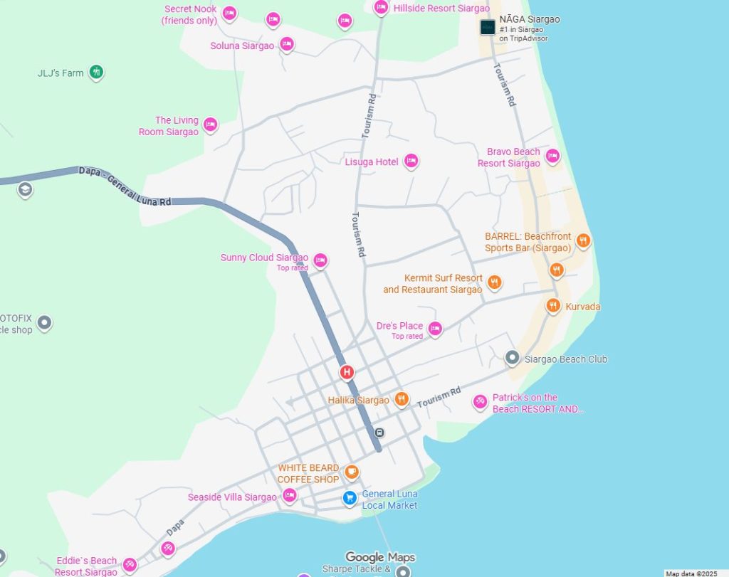 The surf spot and boardwalk face directly into the Pacific Ocean, which is why the waves here are so consistent. Nearby landmarks include the cluster of surf resorts, cafés, and the long stretch of General Luna Beach.